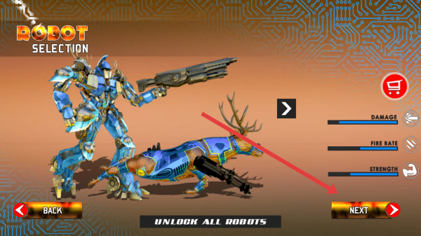 2、在【ROBOT-SELECTION】界面,确认蓝色鹿机器人属性,点击【NEXT】进入关卡选择,准备战斗句号.