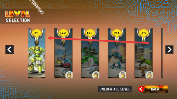 3、进入【LEVEL-SELECTION】,选解锁的【LV.1】关卡,操控绿色机器人,开启首关挑战句号。