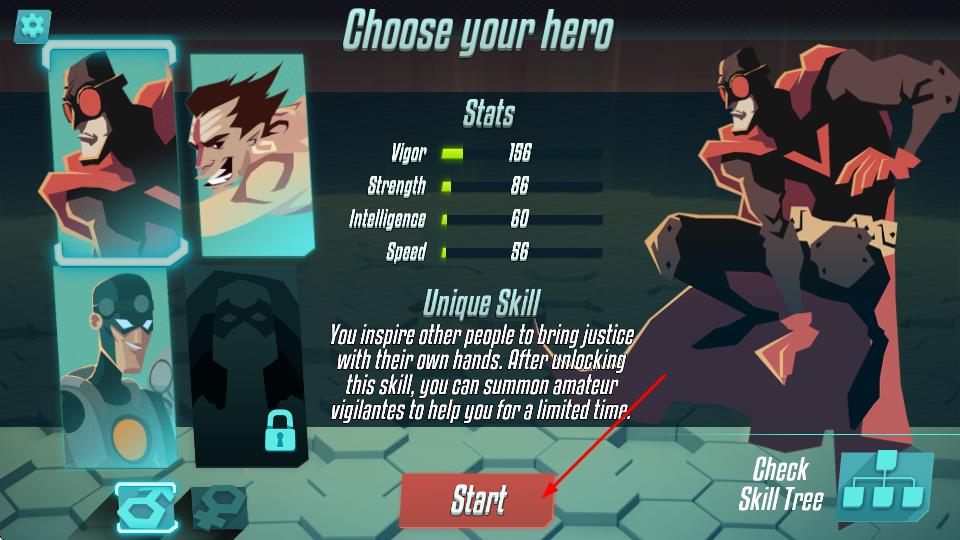 1、进入选角界面,点击红色【Start】按钮,选定英雄开启冒险,开启英雄战斗征程。