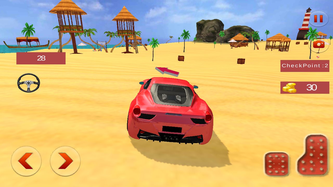 3、驾驶时,按箭头指引(如红色箭头),通过虚拟按键操控跑车,抵达【CheckPoint:2】,收集金币。
