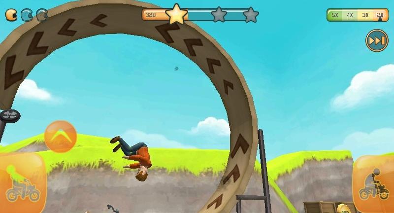 3、面对环形赛道,控制摩托翻转(如红色箭头动作),完成特技,顺利通过,获取星星奖励。