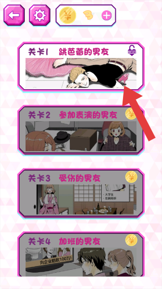 2、这是关卡选择界面,展示了众多等关卡,属于恋爱解谜类内容,玩家可选择关卡开启围绕男女情感的解密冒险。
