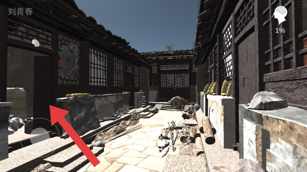 3、画面显示探索进度为1%,呈现的是中式古建风格的庭院场景,有房屋、杂物等布置,右下角有南河相关标识。
