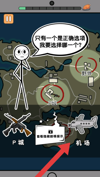 2、呈现火柴人在地图场景(含野外、P城、机场等地点标识),面临选择正确选项的解谜环节,还有武器、飞机等元素及查看隐藏剧情提示功能。
