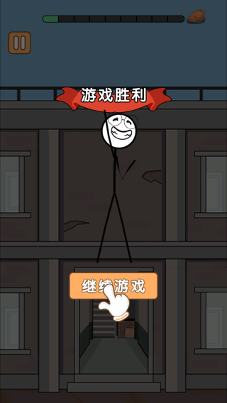 3、这是火柴人逃亡日记的游戏胜利界面,显示火柴人角色,有横幅、继续游戏按钮,代表当前关卡已通关,可点击按钮开启后续内容。