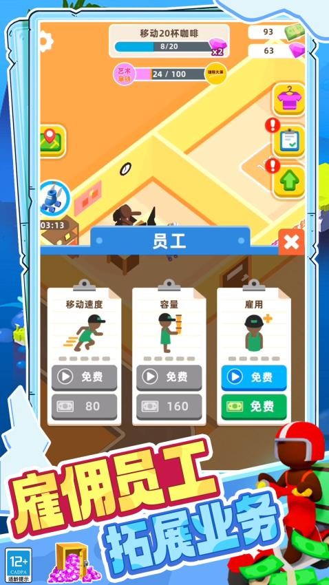 3、员工培养深度玩法,可以招募不同特长的店员,通过培训提升服务速度、饮品质量等属性,打造高效运营团队。