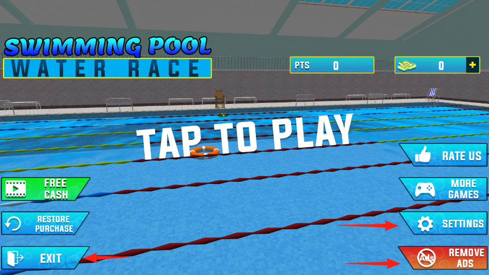 1、显示SWIMMINGPOOLWATERRACE(游泳池水上竞速),有TAPTOPLAY点击开始按钮,还有MOREGAMES更多游戏等选项。