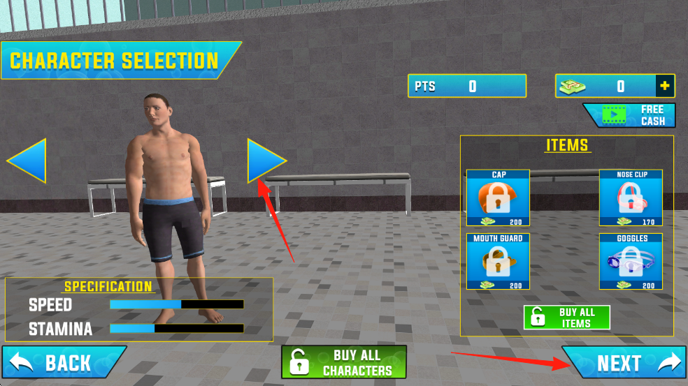 2、角色选择界面,显示CHARACTERSELECTION角色选择,可查看角色速度SPEED右侧有可购买物品(帽子、鼻夹等按钮。