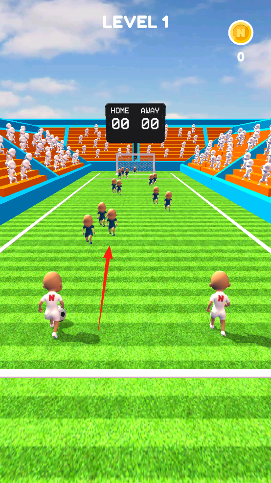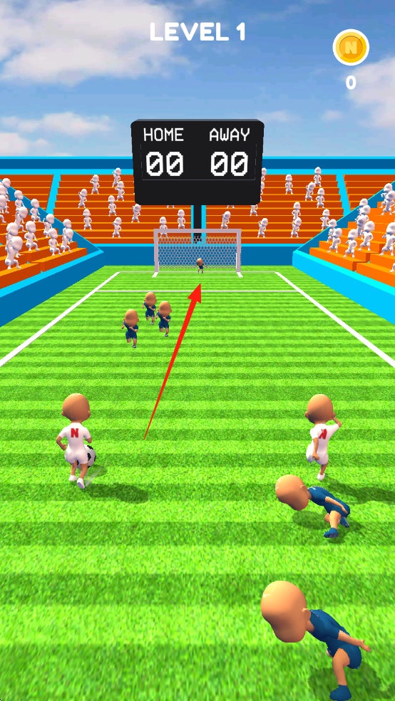 2、第1关射门界面,球按红色箭头方向射向球门,客队球员防守,记分牌仍0,金币0。