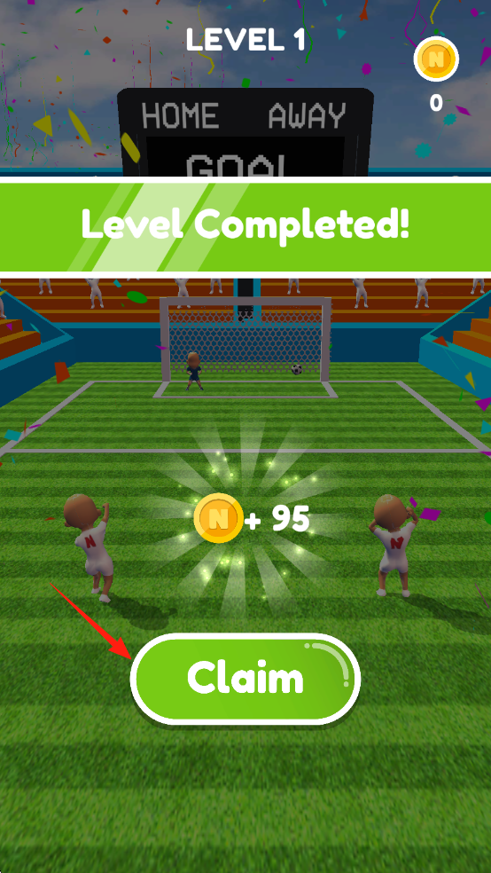 3、第1关完成界面,显示LevelCompleted!关卡完成,获得+95金币,有Claim领取按钮,记分牌主队得分。