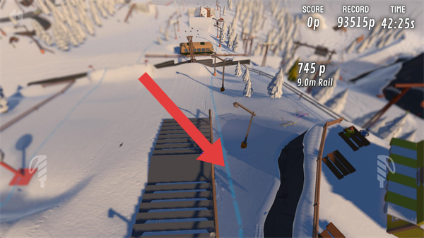 1、自由滑行时,利用地形(如9.0mRail),按提示完成特技,积累得分(当前93515p),提升排名。
