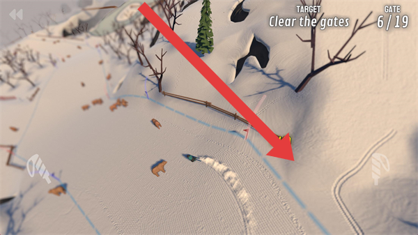 2、门控挑战中,紧盯“6/19”进度,沿蓝线滑行,穿过Gates,注意避开树木、岩石,完成目标。