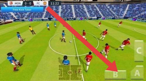 2、进攻时,按箭头指引传球,点击对应按键(A/B)切换传球对象,突破防线,创造射门机会。