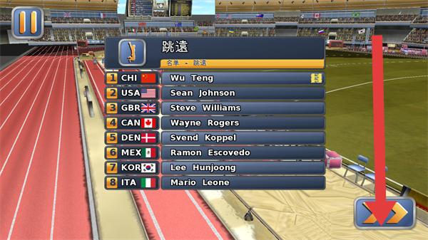 1、进入跳远项目,选“WuTeng(CHI)”,按提示助跑(把握节奏)、起跳(时机精准),争取最远跳距。