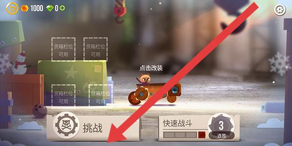 1、进入改装界面,点击货箱栏位,用初始资源装配部件(如火箭武器),提升战车战力,再点挑战或“快速战斗”试玩。