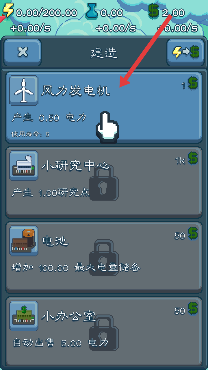 2、进入反应堆能源公司的建造界面,需要花费1美元选择【风力发电机】建造,获取电力产出。