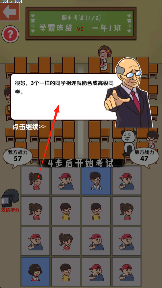 2、观察同学分布,将3个相同的连成一线,合成高级同学,提升我方战力。