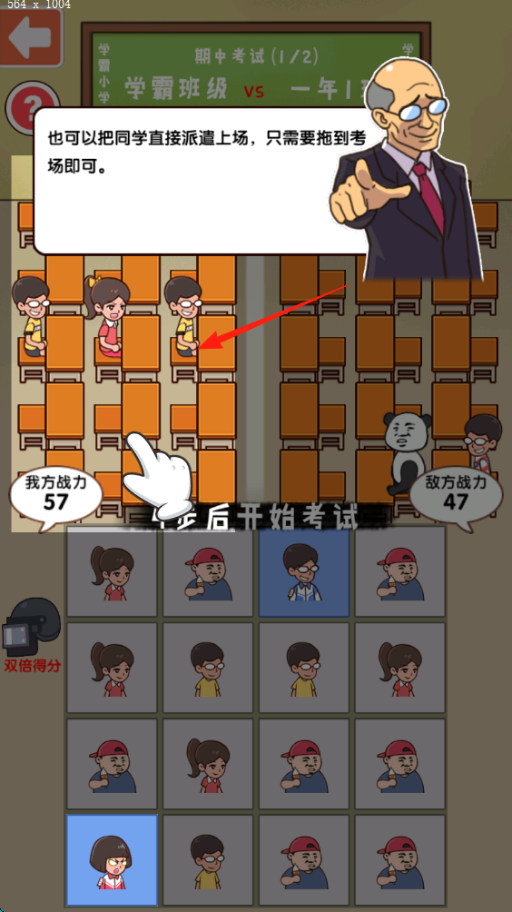 2、策略分配考场阵容:每关开始前可选择召唤已合成的学生进入考场,面对不同难度的分数目标,可保留高级学生,若遇期末考等高分值关卡,则集中投放最强学生。