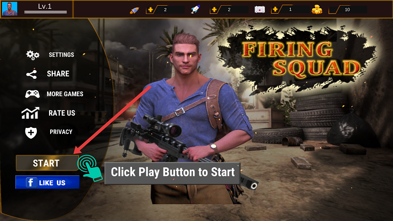 1、跟着绿色的手指图标引导操作,点击左边菜单的START进入游戏。