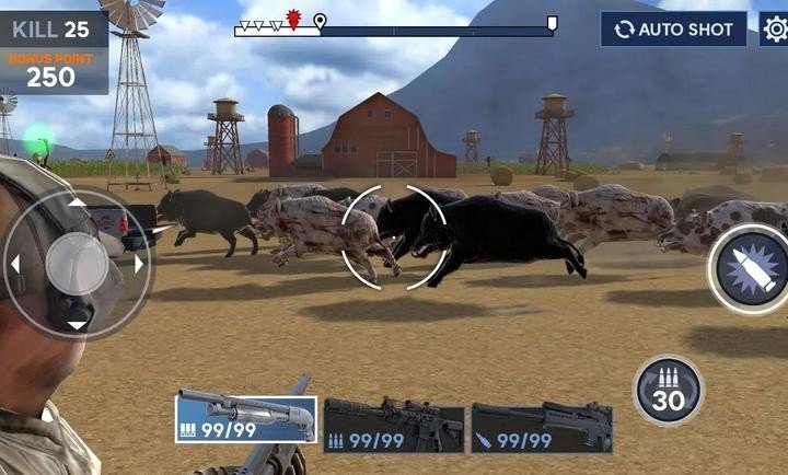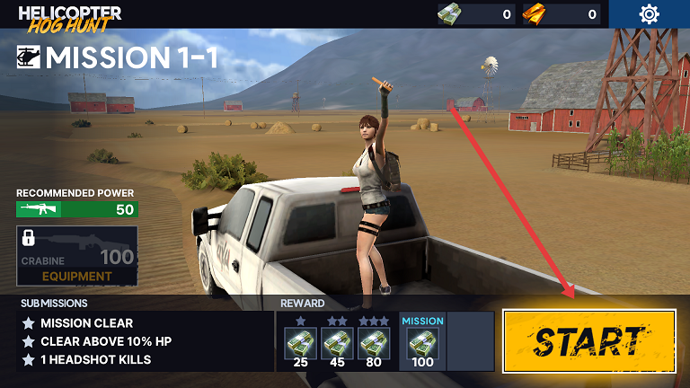 1、点击右下角START开始游戏,左手摇杆控制转换视角,右手瞄准镜锁定射击野猪。