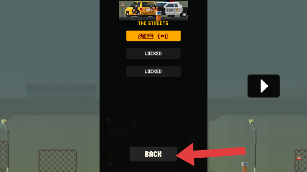 2、显示THESTREETS(街道)关卡,有阶段1-1,可进入、两个LOCKED(锁定)关卡,还有BACK(返回)按钮,呈现游戏内关卡及界面操作相关实体信息。