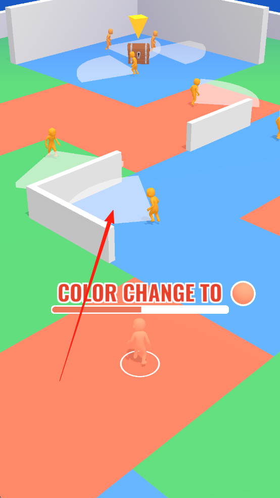1、场景中有多个橙色小人,地面分绿、红、蓝区域,上方有COLORCHANGETO及橙色圆圈提示,红色箭头指示移动方向。