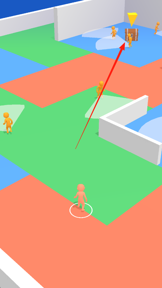 2、橙色小人在绿色区域,红色箭头指向宝箱处,周围有其他橙色小人及蓝色、绿色区域。