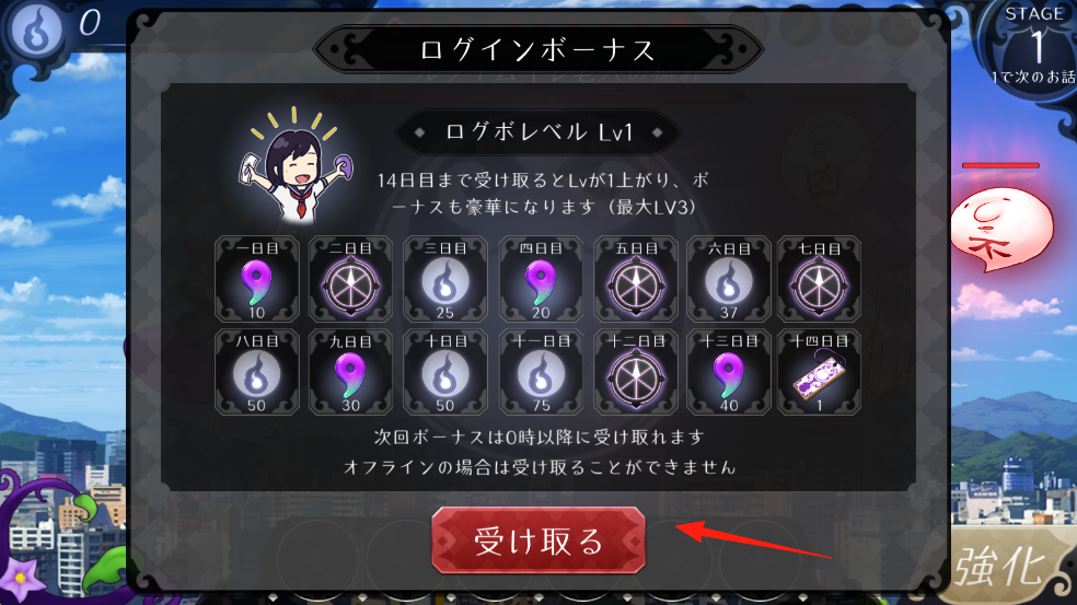 2、登录奖励界面,ログインボーナス(录奖励)登录奖励等级Lv1),14天奖励展示,有“受け取る(领取)”按钮。