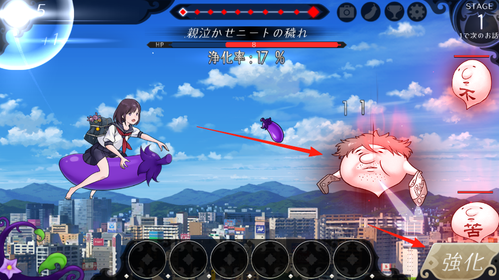 3、游戏战斗界面,角色攻击敌人,显示親泣かせニートの穢れ(啃老族的污秽),HP生命值,有強化按钮,红色箭头指示攻击目标。