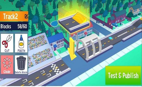 3、在【Track2】编辑赛道,用【Cut】【Paste】等工具,放置建筑、观众块,完成后点【Test-Publish】测试。