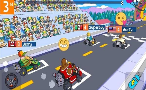 1、比赛开始,操控卡丁车,利用氮气(蓝色道具),在直道加速,弯道漂移,超越对手(如Jerry)。