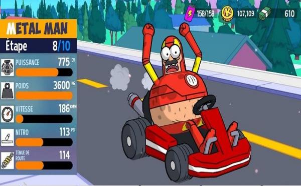 2、查看赛车属性(如【METAL MAN】的puissance、vitesse),升级强化,提升赛车性能,助力夺冠。