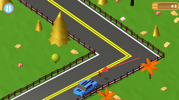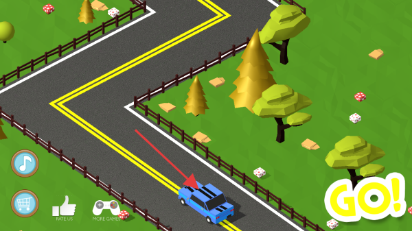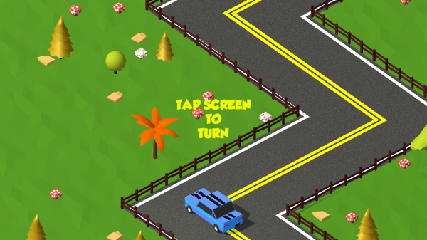 1、按提示【TAP SCREEN TO TURN】,点击屏幕让蓝色汽车转弯,沿道路行驶,避开围栏。