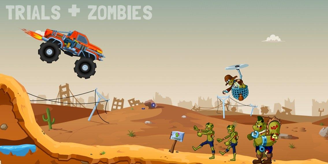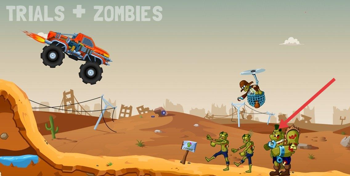 2、选橙色赛车,在荒漠赛道,飞越坡道,撞击地面僵尸(如举臂绿僵尸),躲障碍,完成挑战。