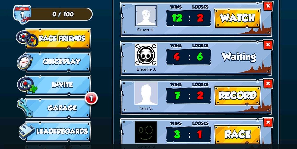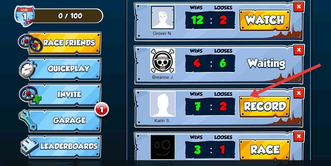 3、在【LEADERBOARDS】,点【RECORD】看KarinS.对战记录(7:2),学习技巧,准备【RACE】。