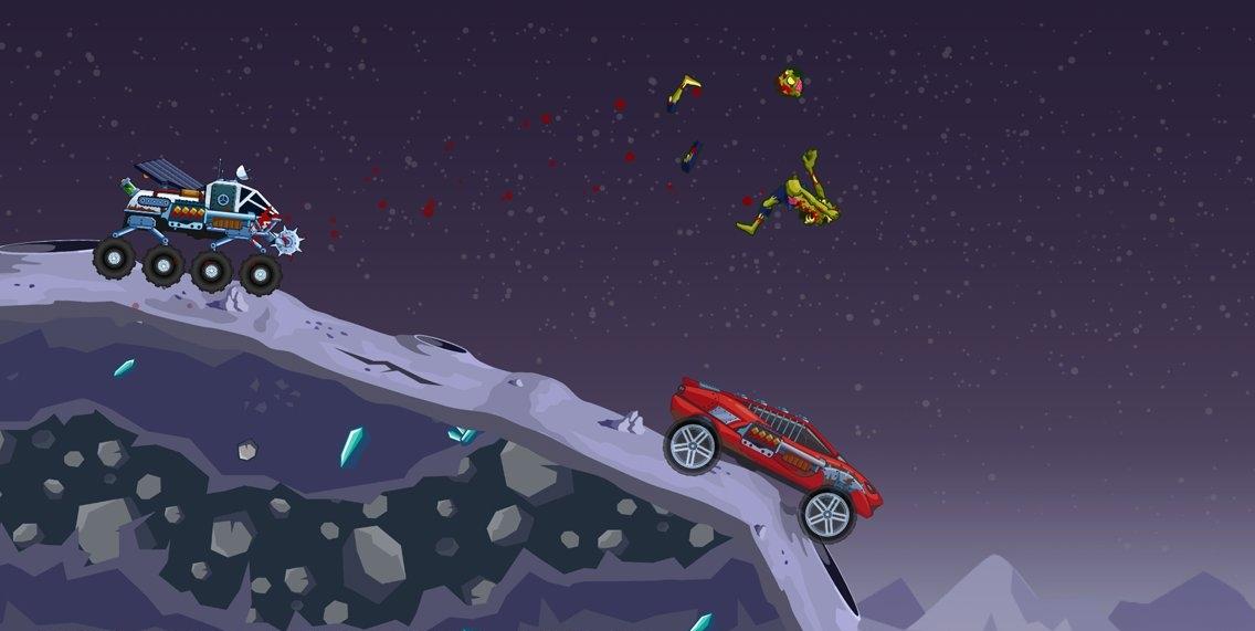 1、驾驶改装车,在月球地形行驶,撞击僵尸(空中绿色僵尸),注意避开岩石,保持车速。