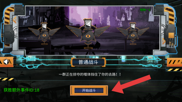 2、这是战斗准备界面截图,有普通战斗按钮,一群正在掠夺的掩体挡住了你的去路!!提示文本,点击【开始战斗】按钮,以及画面中的敌方掩体怪物等。