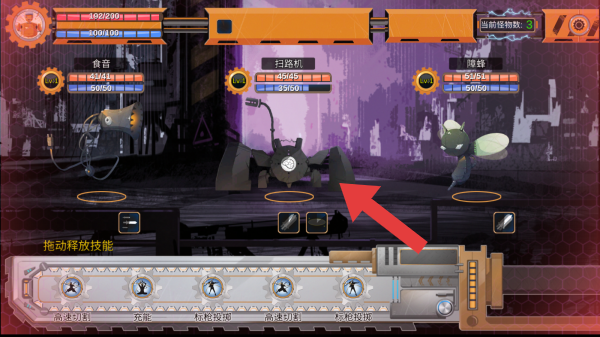 3、应血量、护盾值等数据,战斗场景中的怪物(箭头指向的扫路机样式怪物),下方技能释放栏及拖动释放技能提示。