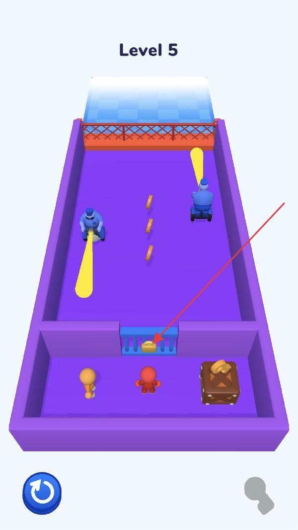 1、进入Level5等关卡,观察巡逻敌人(蓝色角色)视野范围,规划路径。