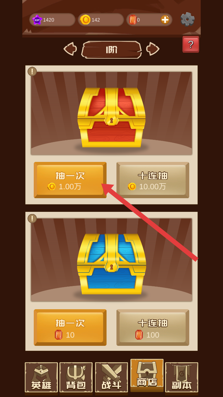 3、在商店抽奖页,选【1阶】宝箱,用1.00万金币【抽一次】,获取新宠物或道具,助力阵容养成。