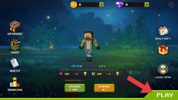1、UPGRADE、SHOP、QUEST、RANKING、DAILYGIFT、LUCKYSPIN,点击【PLAY】(开始游戏)按钮。
