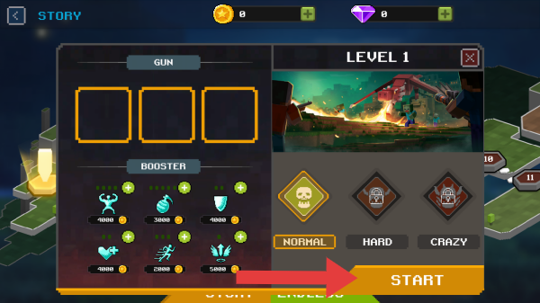 2、LEVEL1难度,有NORMAL、HARD、CRAZY以及START按钮,右侧还有关卡场景预览图,是像素枪战等像素射击冒险游戏的故事模式选关界面。