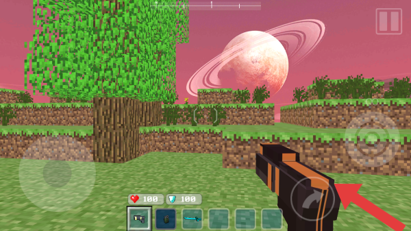 3、呈现像素风格场景,有草地、树木、行星,界面显示角色持有武器,生命值与护甲值均为100,属于射击玩法景,体现了游戏开放世界与创意玩法融合的特点。
