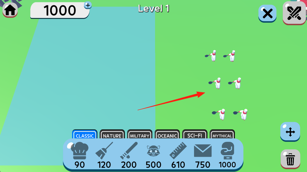2、游戏关卡(Level1)界面,显示可用金币1000,有不同兵种分类(CLASSIC、NATURE等),红色箭头指向敌方单位。