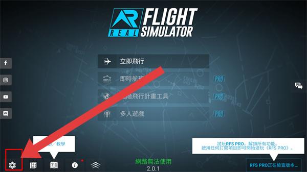 1、在RFS真实飞行模拟的游戏主界面,点击左下角齿轮状【设置】图标,进入系统设置界面。