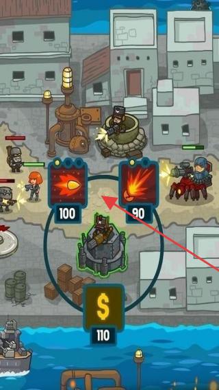 2、战斗时,点击塔楼技能(火焰、炮弹图标),消耗金币($110)释放,高效清敌。