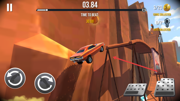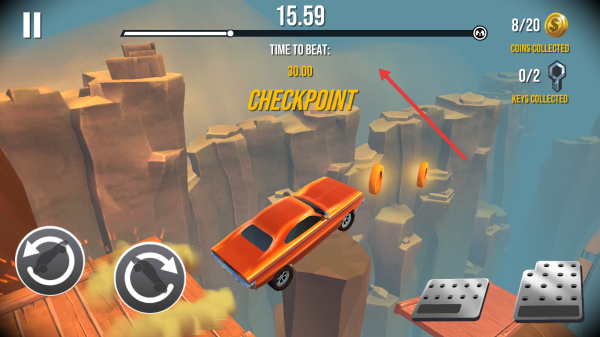 3、看到【CHECKPOINT】标识后,途中留意金币,用加速和翻转操作,在限时内飞跃峡谷,顺利抵达checkpoint点,完成阶段挑战句号。