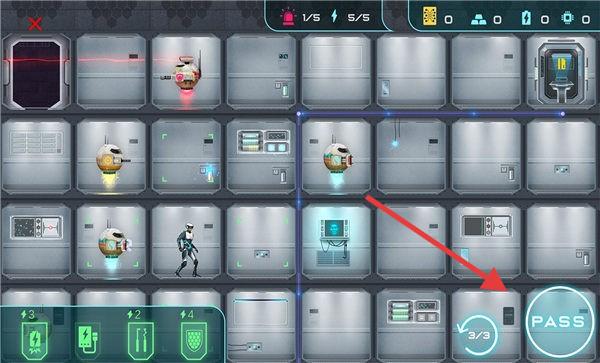 1、太空舱场景,有角色、机器人、舱室,显示“PASS”按钮,箭头指向舱室。