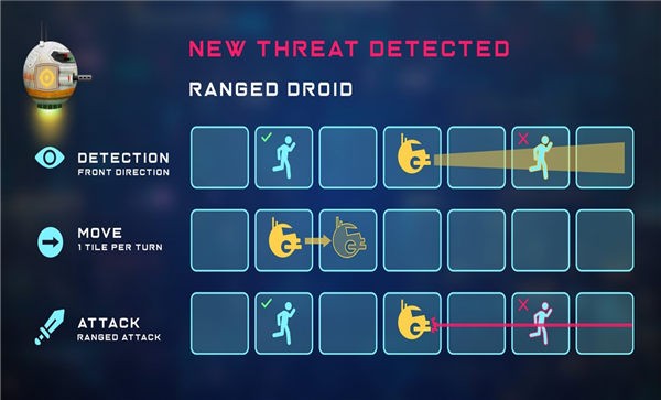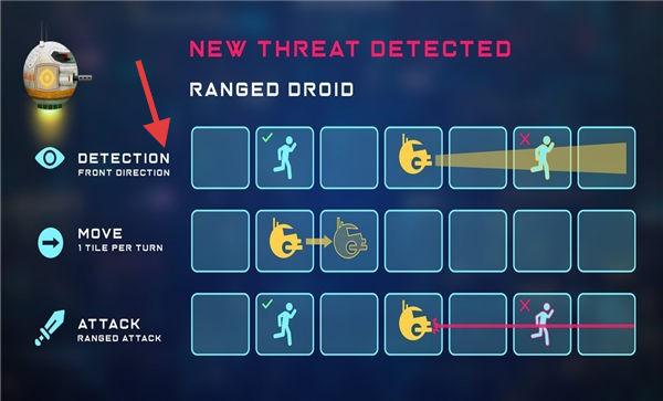 2、威胁检测界面,显示NEWTHREATDETECTED检测到新威胁,RANGEDDROID远程机器人,MOVE(移动)ATTACK(攻击)策略选项。
