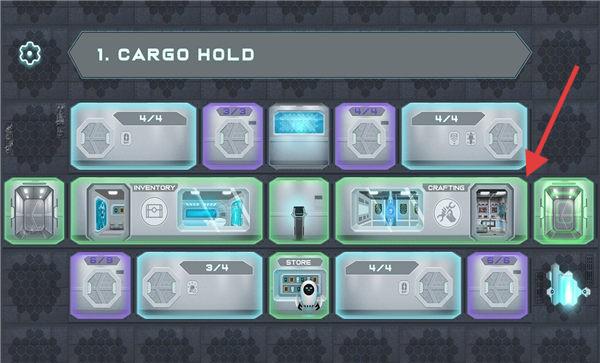 3、太空舱区域界面,显示1.CARGOHOLD(1.货舱),有“INVENTORY(库存)”“CRAFTING(制作)”等舱室,箭头指向舱室。